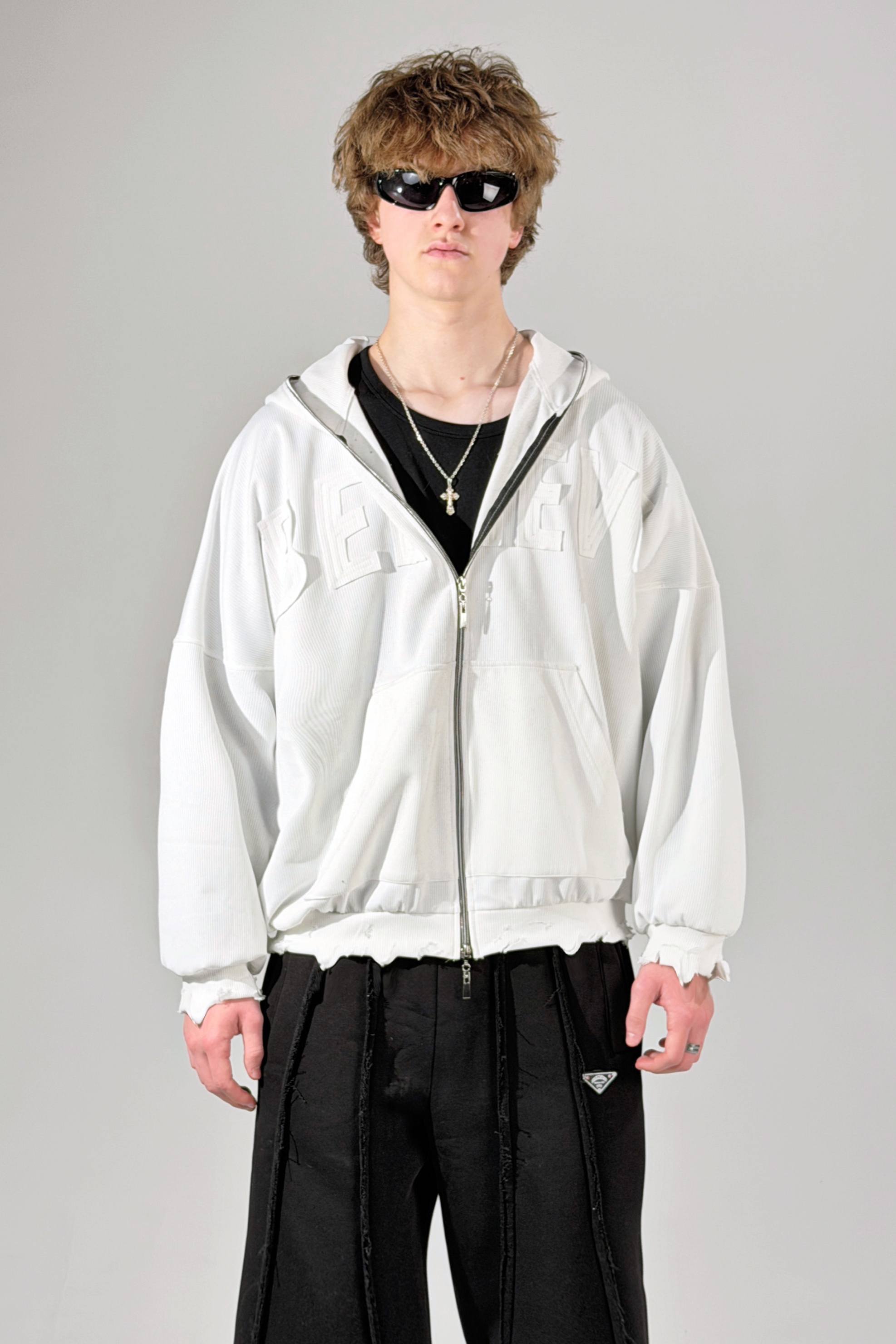 Низ рукавів і виробу оформлено raw edge finish (деконструйований край) — дизайнерський прийом, що додає фактурності та відчуття усвідомленої недбалості, притаманної high-end casual сегменту.